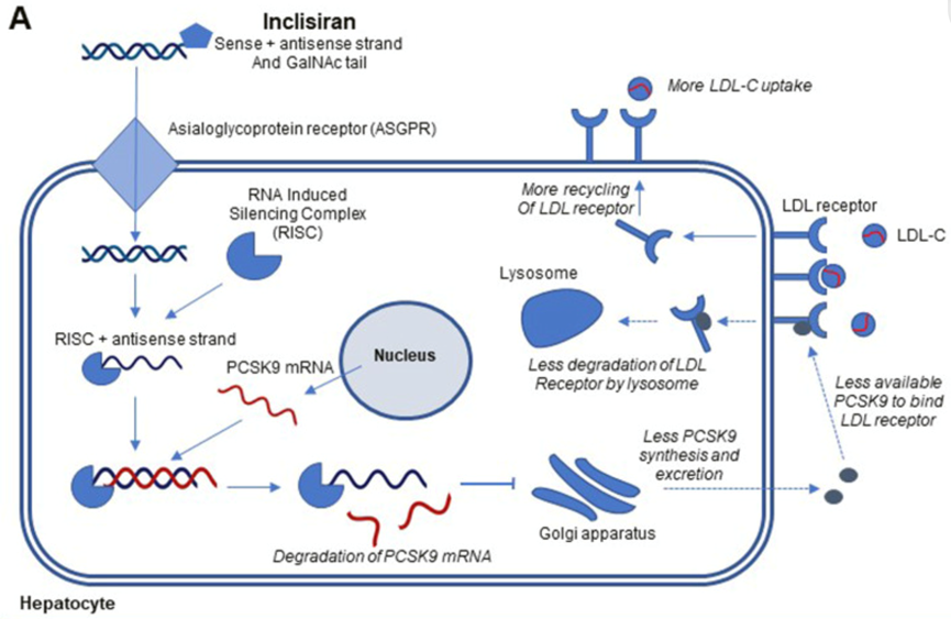 因此,小核酸药物的长效性、不易产生耐药性等优点,让产业界逐渐认识到,小核酸药物或许可在慢性病领域大有作为。心血管疾病(CVD)是全球人口死亡的主要原因之一。WHO数据显示,每年约有1790万人死于心血管疾病,占全球死亡人数的32%。动脉粥样硬化性心血管疾病 (ASCVD) 是心血管系统疾病中最常见的疾病。ASCVD 涉及动脉中胆固醇斑块的积聚,包括急性冠状动脉综合征、外周动脉疾病以及心肌梗塞和中风等事件。低密度脂蛋白胆固醇 (LDL-C) 水平升高是导致 ASCVD 发生及发展的重要因素,所以降低 LDL-C 水平可以有效降低心血管疾病风险。他汀类药物是降低LDL-C 水平的常用药物,但因需采用联合用药,其副作用发生率较高。从美国ASCVD情况来看,经他汀药物治疗后,仅20%的患者达到了LDL-C控制的目标,存在较大的临床未满足需求。前蛋白转化酶枯草杆菌蛋白酶9 (PCSK9) 于2003年发现,是参与调控LDL-C的重要靶点之一。PCSK9 特异性与肝细胞表面的低密度脂蛋白受体 (LDL-R) 结合,防止 LDL 再循环并促进 LDL 在内体或溶酶体中降解,从而导致低密度脂蛋白胆固醇清除率降低。PCSK9 以非酶方式增强其所有靶蛋白的细胞内降解。
