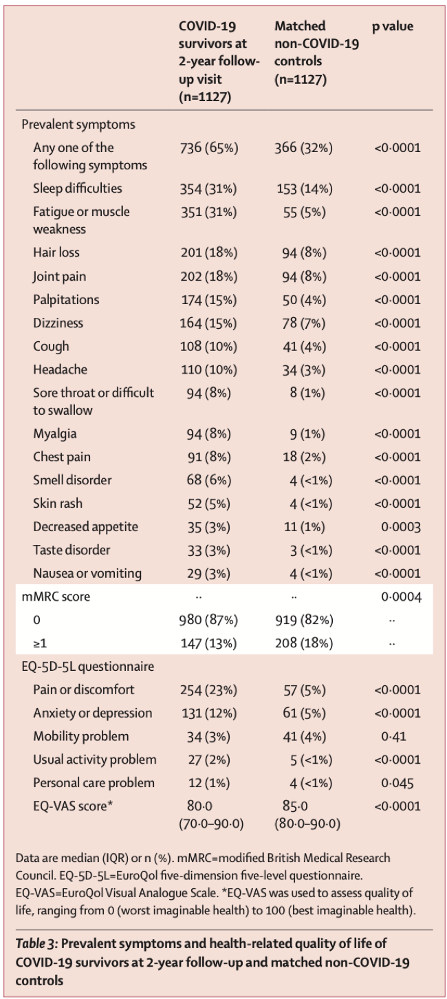 图3. Long COVID患者与健康对照组临床症状与健康生活质量相关指标对比,来源:参考6