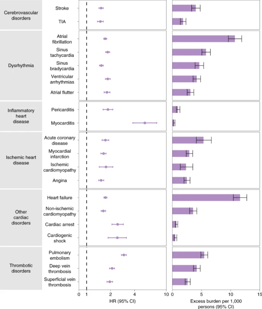 研究人员发现在SARS-CoV-2感染后30天,COVID-19患者发生心血管疾病的风险增加,包括脑血管疾病、心律失常、缺血性和非缺血性心脏病、心包炎、心肌炎、心力衰竭和血栓栓塞性疾病。即使在感染急性期未住院的受试者中,这些风险和负担也很明显。